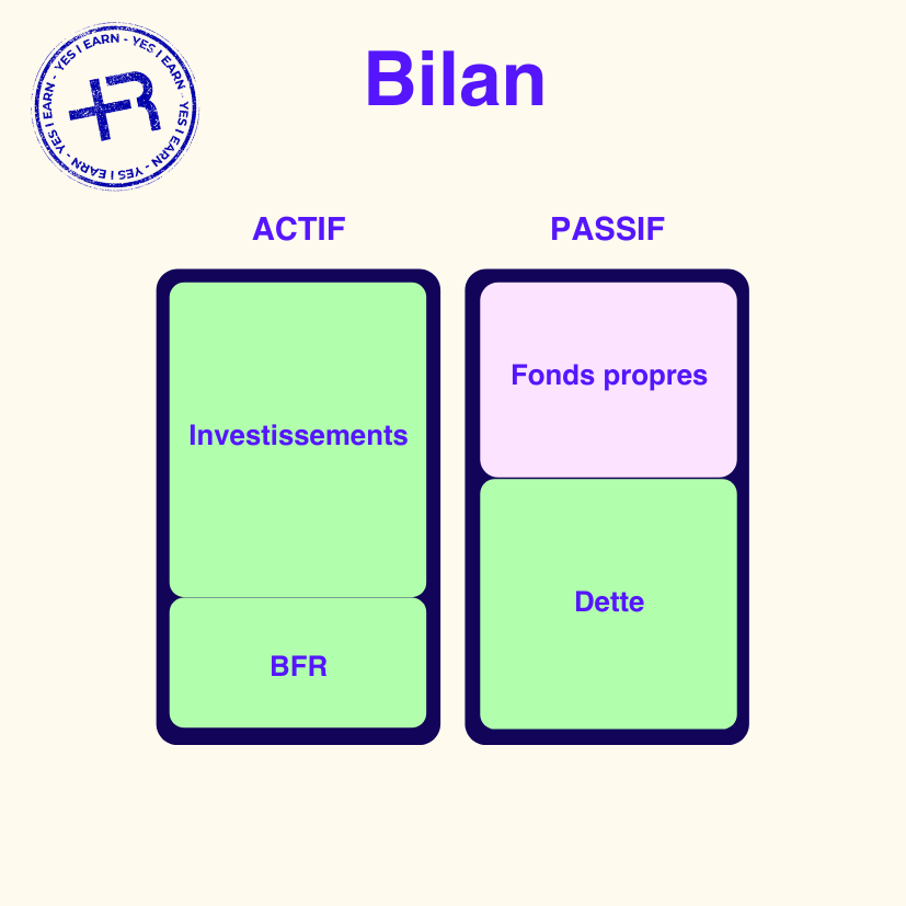 Les capitaux propres correspondent principalement aux apports des associés et aux résultats mis en réserves. C’est le trésor de guerre de l’entreprise. Lorsque vous levez des fonds auprès d’investisseurs, les capitaux propres (ou “fonds propres”) augmentent. Nous verrons que la part de détention du capital social est liée aux droits de votes des associés. Le financement par fonds propres est un mode de financement dilutif : lorsqu’une personne ajoute de l’argent dans le capital de l’entreprise, la part de détention du capital des autres diminue. Ce qui peut impacter leurs droits de vote lors de l’assemblée générale, et donc, leur pouvoir de décision.